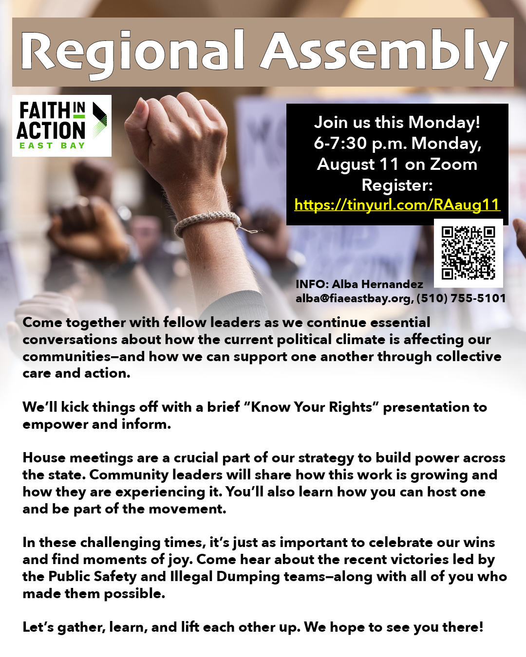 Location: Mt Zion MBC, 1203 Willow Street Night walks: 6pm: Gathering for pre-walk/corners process 6:30pm: walk or stand on corners 7:30pm: returned back to starting location or completed from the corners By 7:45pm, walk process completed For more information, please contact alba@fiaeastbay.org